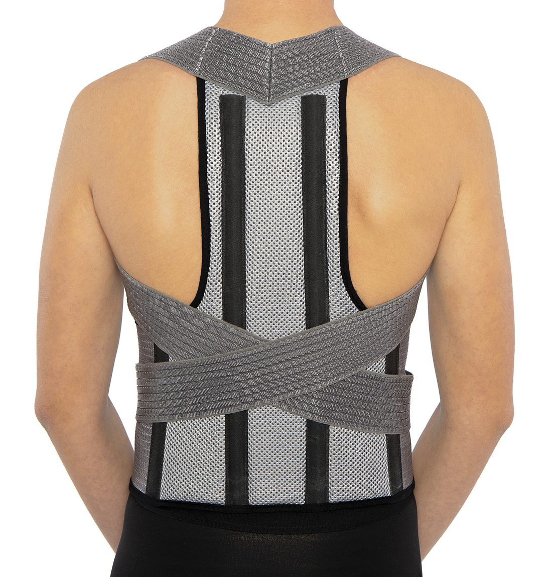 Νάρθηκας κορμού από πλεκτό ελαστικό ύφασμα με επενδεδυμένο air mesh, με εσωτερική βαμβακερή επένδυση, 2 ψηλές μεταλλικές μπαλένες που υποστηρίζουν την σπονδυλική στήλη και άλλες 2 πιο χαμηλές για υποστήριξη της μέσης. Έχει 2 ιμάντες με μαξιλαράκια για καλύτερη εφαρμογή και στήριξη. Κλείνει με Velcro.