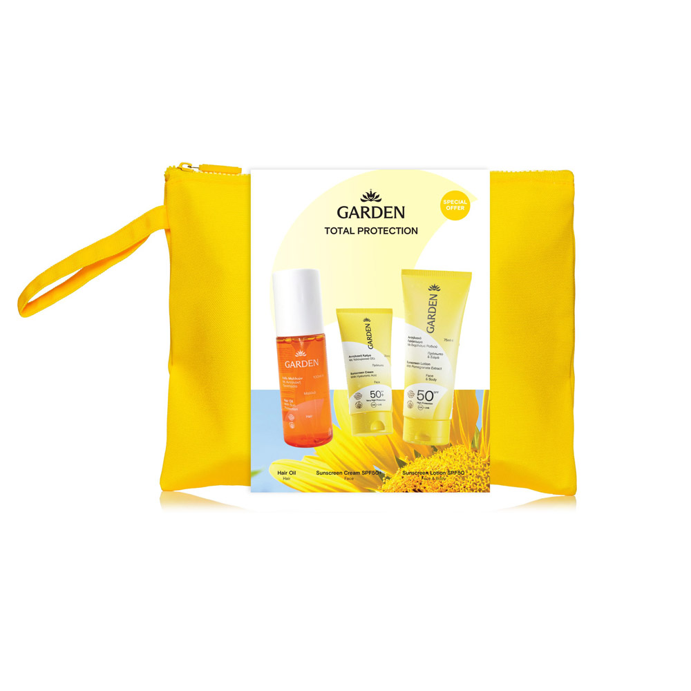 Αντηλιακό Γαλάκτωμα με Εκχύλισμα Ροδιού Πρόσωπο & Σώμα SPF50 75ml + Αντηλιακή Κρέμα Προσώπου με Υαλουρονικό Οξύ SPF50+ 25ml + Λάδι Μαλλιών με Αντηλιακή Προστασία 100ml + Garden Μεγάλο Ριγέ Νεσεσέρ